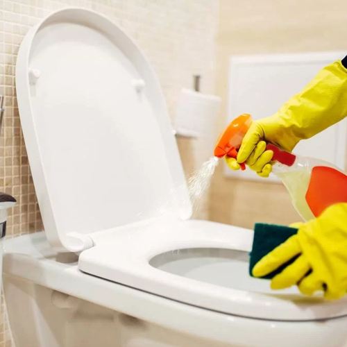 Scrubbing and sanitizing toilets, sinks, showers, and tubs.