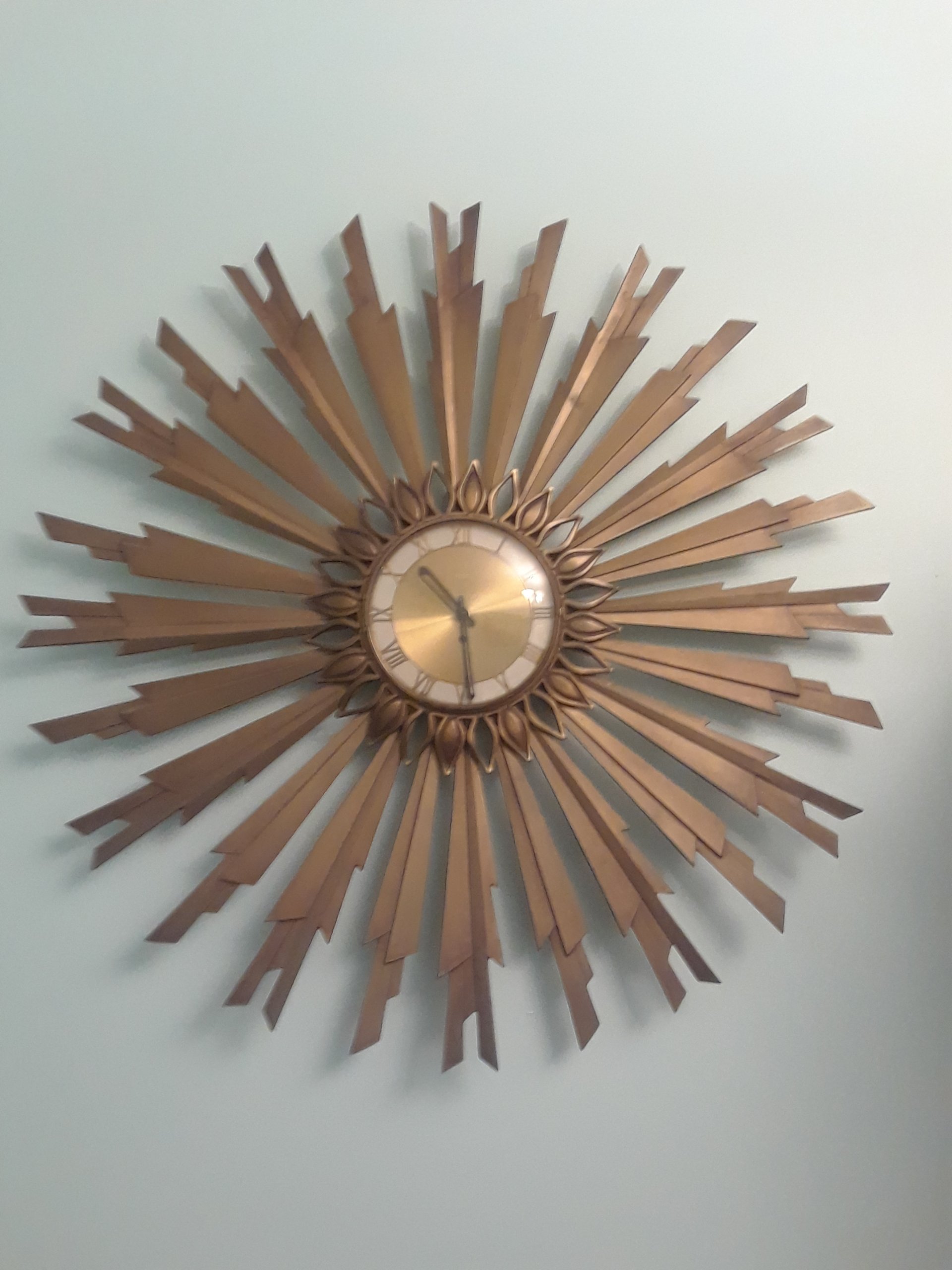 This Westwood brand clock has a wind-up mechanism. Unfortunately it doesn't currently work. It is over 2 and a half feet wide and is heavy.