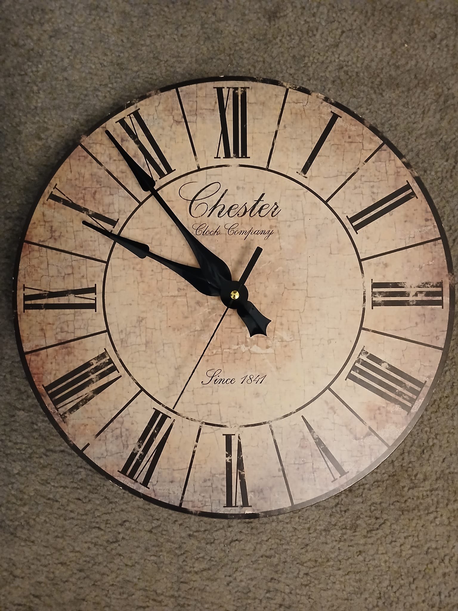 This clock is 14 inches wide and runs on 1 AA battery. It is made from wood.