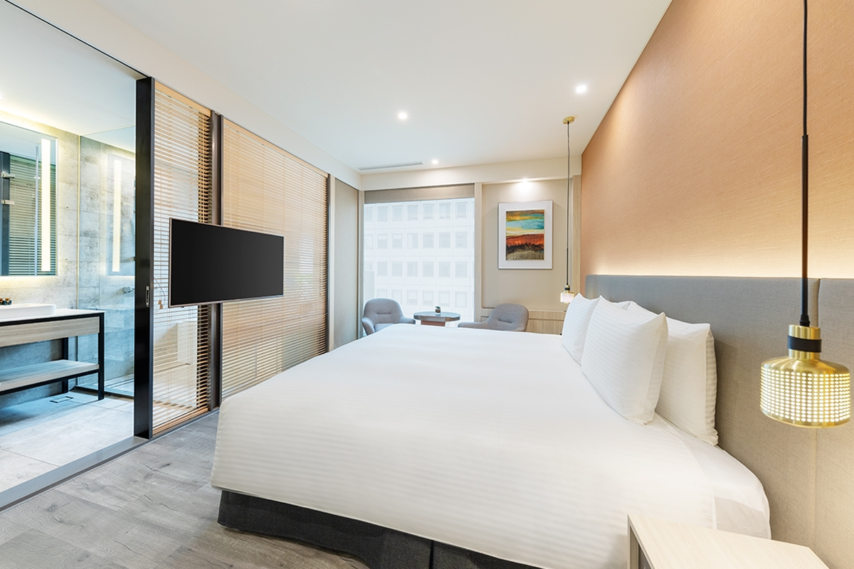 A spacious room with a king-size bed, modern amenities, and stunning city views.