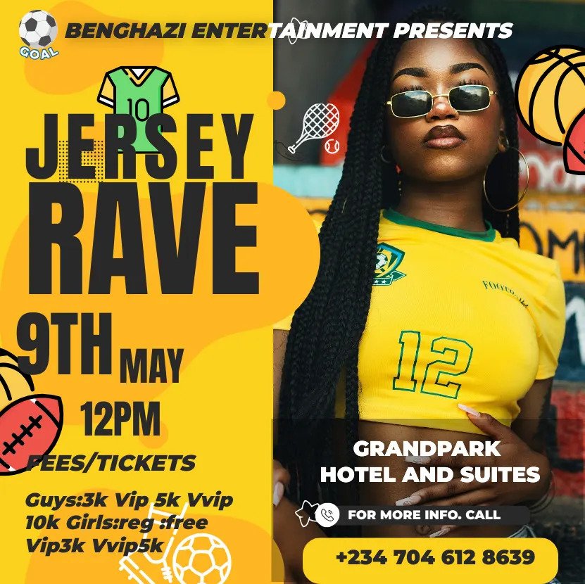 Benghazi entertainmentPresents Jersey rave Date:9th of mayTime:12pm till Mama calls Where:Grandpark hotel and suites Things to expect: maximum fun Djs Dj icz ,Dj one touch hypeman :hypeman venom ,freaky,bobby IG@squadarazi._boys