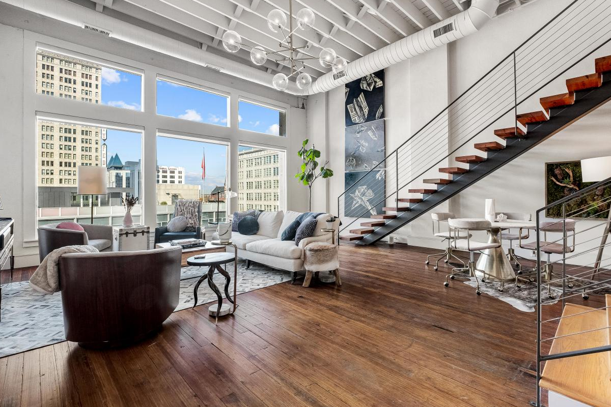 A 3-bedroom, 3-bathroom penthouse with open-plan living and industrial design.