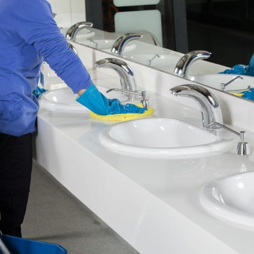 Scrubbing toilets, sinks, and floors; restocking supplies.