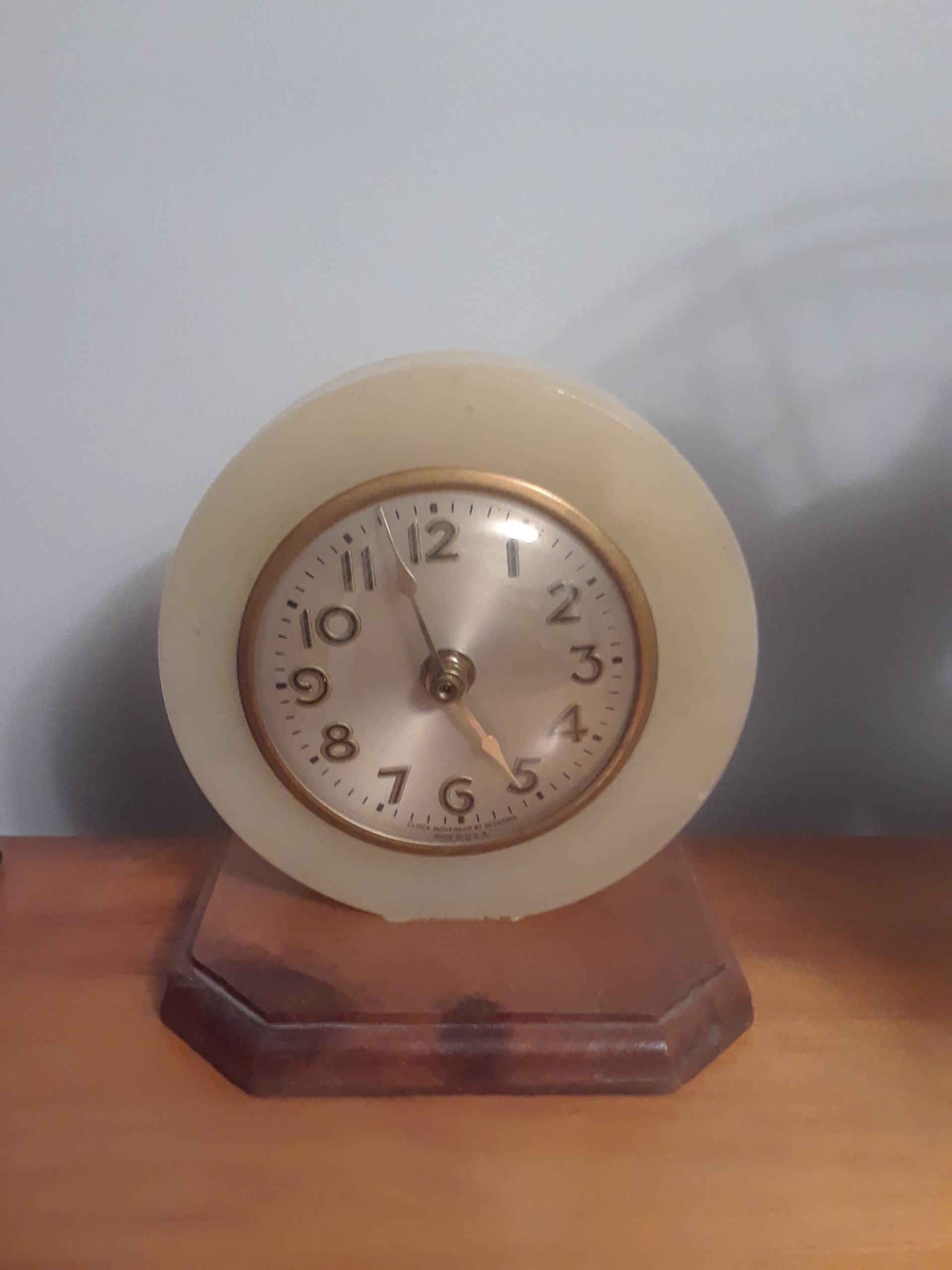 This Sessions brand clock runs on 1 AA battery. The body of the clock is stone which I think is soapstone or marble. The base is wood.