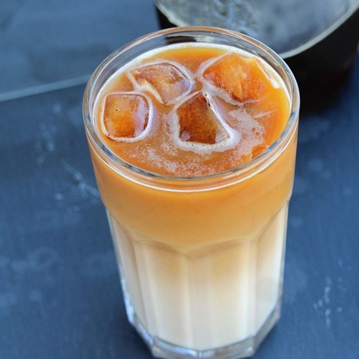 Espresso with steamed milk is available in vanilla, caramel, or hazelnut flavors.