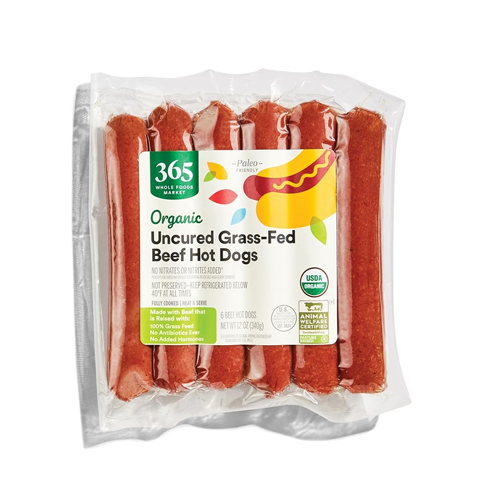 365 by Whole Foods Market, Beef Hot Dog Uncured Grass Fed Organic Step 4, 12 Ounce.