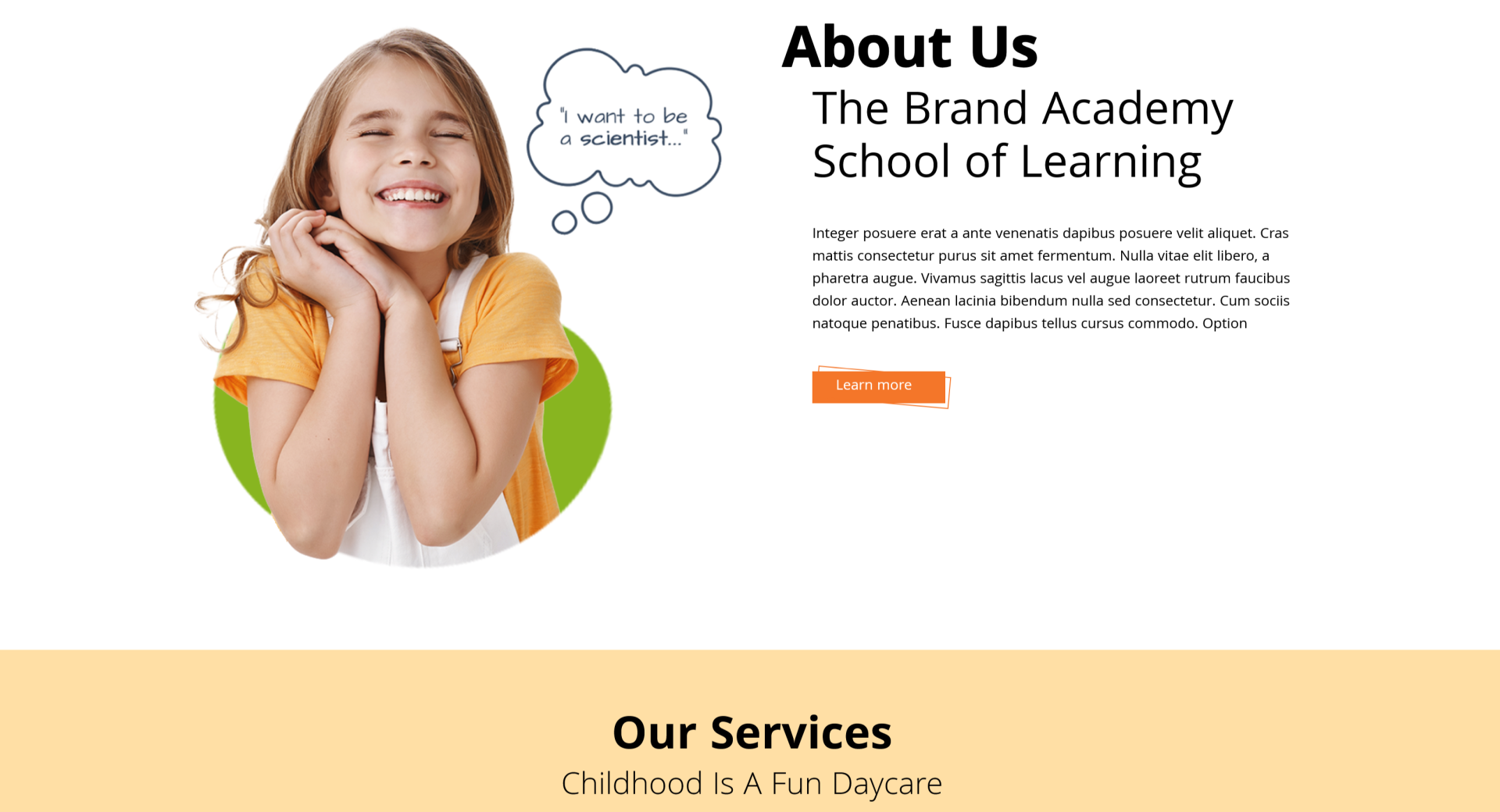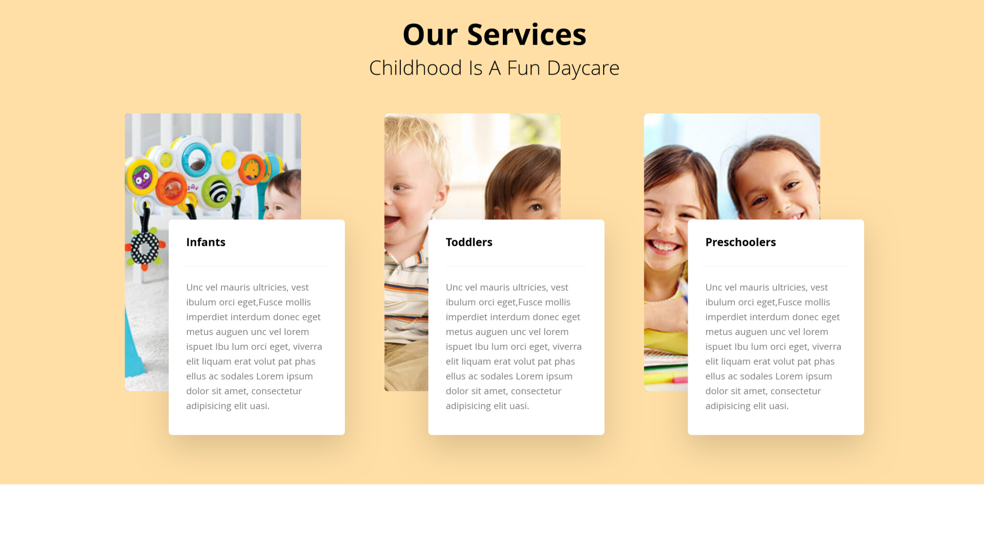 - Services: Highlight your daycare programs, including infant care, toddler care, preschool programs, after school care, special needs care, and more.