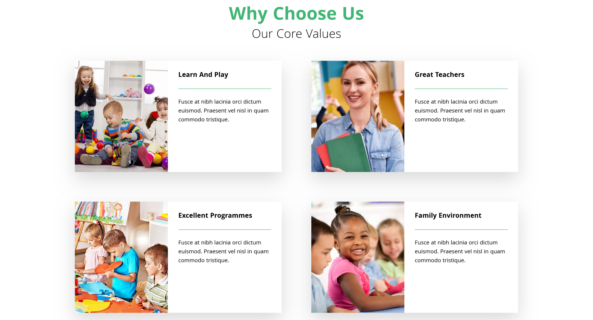 Gallery or Media Page: Highlight fun activities, classrooms, and events to build credibility with families.