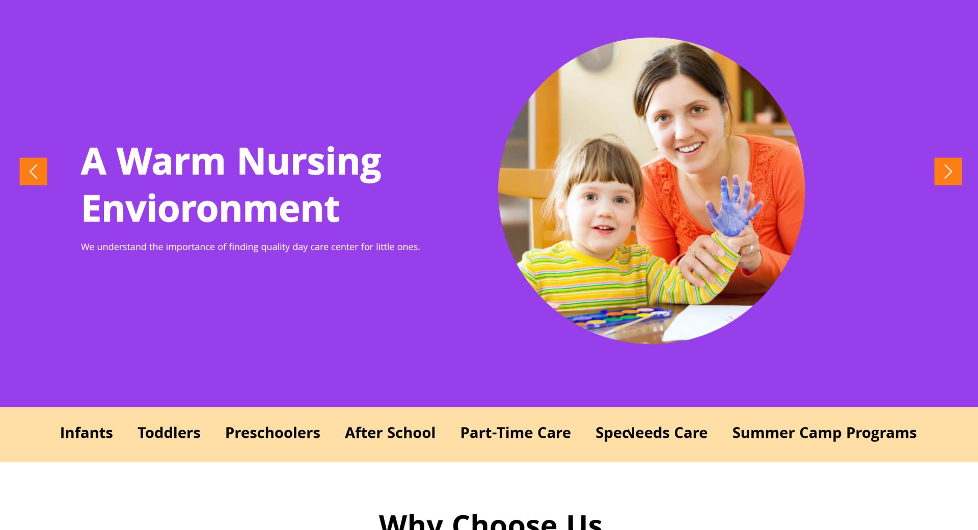 Service-Focused Pages: Showcase offerings like infant care, toddler activities, and preschool programs.